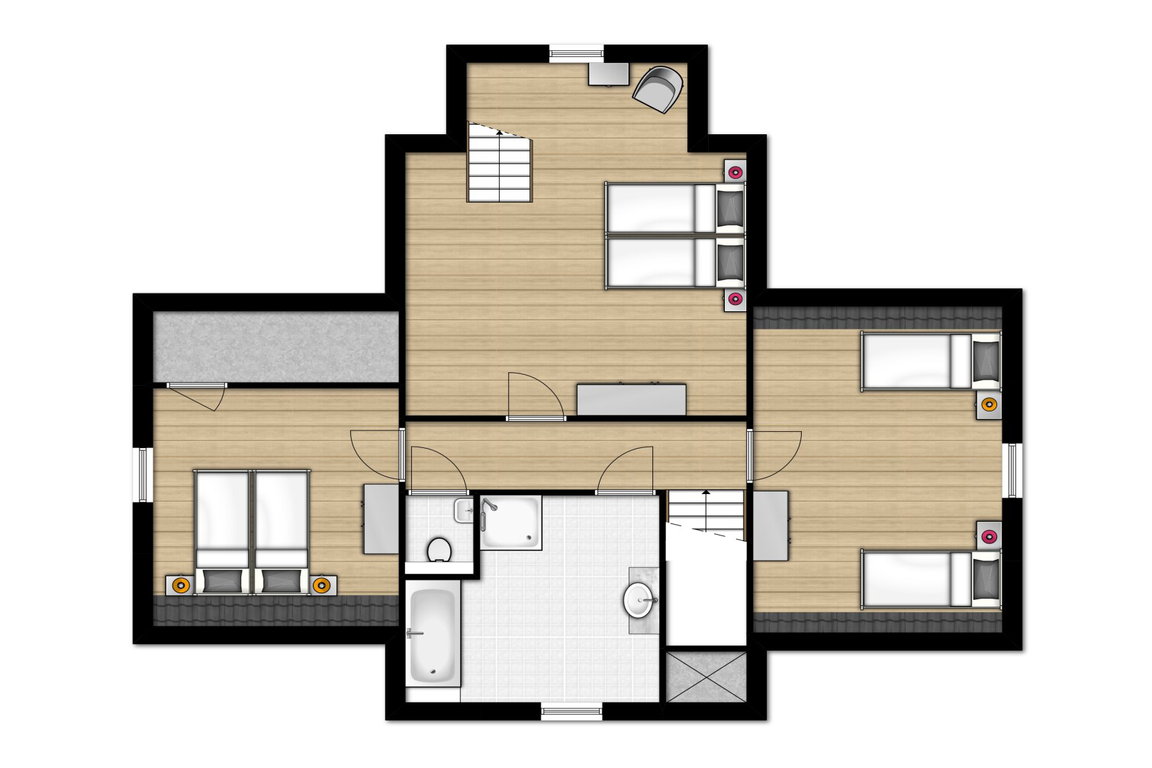 Im Erdgeschoss befindet sich ein Badezimmer und ein Schlafzimmer mit zwei Einzelbetten. Das Obergeschoss bietet ein weiteres Badezimmer mit Toilette und Dusche, drei Schlafzimmer und ein besonderes Turmzimmer. Alle Schlafzimmer sind mit Auping-Betten oder Boxspringbetten ausgestattet, wobei das Turmzimmer ein zusätzliches Einzelbett bietet. TV-Geräte sind auch in den Schlafzimmern vorhanden. Die Villa liegt direkt am Wasser und verfügt über einen eigenen Anlegesteg mit einem Ruderboot, einen Abstellraum und eine (überdachte) Terrasse mit Gartenmöbeln sowie 2 Parkplätze am Haus. Die Nutzung von WiFi ist kostenlos.