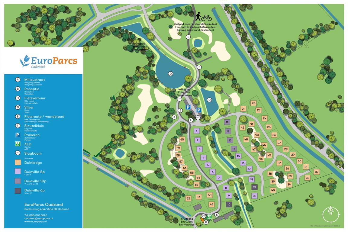 Der Ferienhauspark „EuroParcs Cadzand“ liegt am Badhuisweg zwischen dem alten Dorf Cadzand mit seiner malerischen Windmühle und dem neuen Cadzand-Bad mit seinen familienfreundlichen Stränden nur zehn Minuten Fußweg von den Dünezugängen entfernt. Im Sommer 2023 eröffnet, erwarten Cadzand-Urlauber mitten im Polder insgesamt 70 ein- bis zweigeschossige Ferienhäuser mit zentraler Rezeption, einem Spielplatz sowie Ladestation für Elektroautos, Fahrradverleih, Lebensmittelselbstbedienungsladen und Brötchenservice. Ein kleiner See mit Kanälen lädt zum Spazierengehen ein; der Short-Golfplatz Cadzand-Bad liegt direkt gegebenüber. Die vier freistehenden Dünenvillen- und kleineren Dünenlodge-Typen haben eine Größe zwischen 40 und 113 q und bieten mit drei bis fünf Schlafzimmer Platz für vier bis zu zehn Personen; Gäste können bequem direkt am Ferienhaus parken.