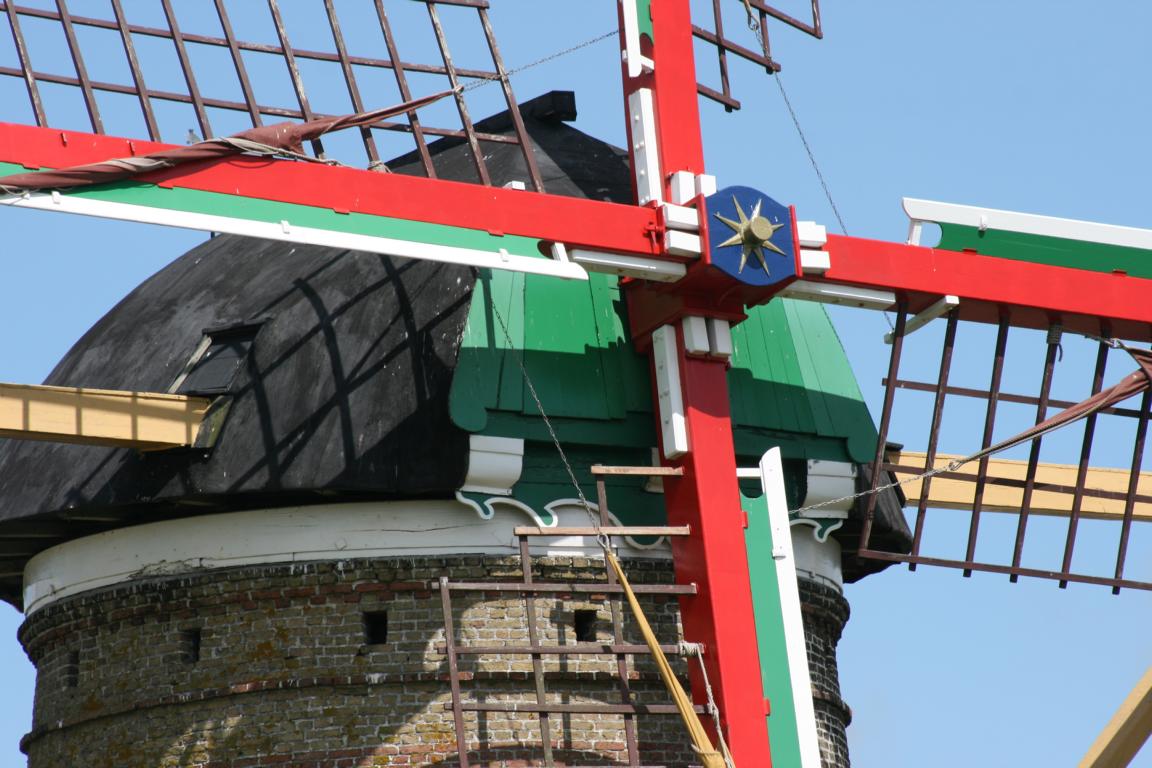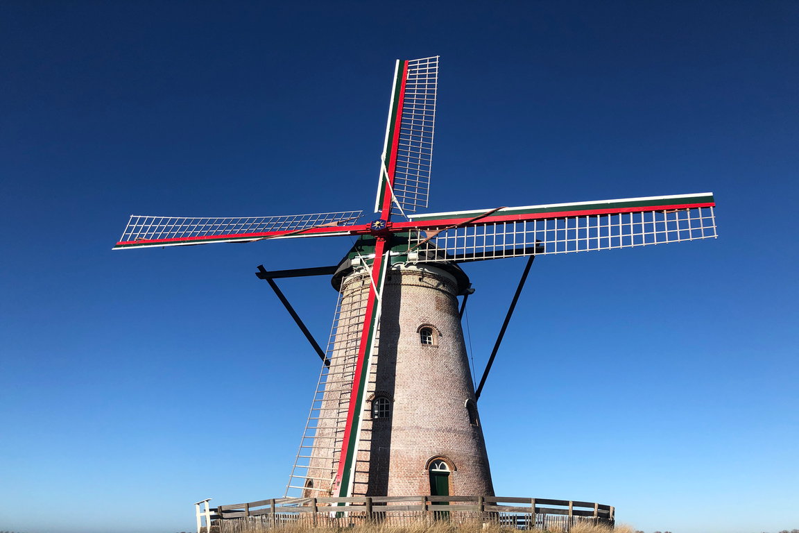 Malerischer kann wohl kaum eine Windmühle wie die von Zuidzande liegen: Im Hinterland von Cadzand-Bad, mitten in den Poldern, am westlichen Rande des Dorfes am Sluissedijk. 1874 wurde die namenlose Mühle erbaut, 1981/1982 restauriert, seit 1999 ist sie nicht mehr im Betrieb. Die Getreidemühle ist im Besitz der Stiftung ‚Behoud Zuidzandse Molen‘ (Stiftung zur Erhaltung der Zuidzande-Mühle) erworben, die auch einen großen Zuschuss von der Provinz Zeeland für die Restaurierung erhalten hat. Das Mauerwerk wurde 2020 mit ausgetauschten und neu verfugten 7.000 Steinen repariert, ein neuer „Steert“ (Schwanz) und ein neuer Giebel werden angebracht, und die Kappenkonstruktion und der Antrieb werden repariert. Nun steht die Mühle quasi wie neu da. Neben der beeindruckenden Mühle ist noch das alte Haus des Müllers platziert, ansonsten steht die Mühle auf ihrem Sockel frei im Feld und kann mit ihrer Spannweite von 24,20 Metern den Wind über den Feldern von Zuidzande frei empfangen.