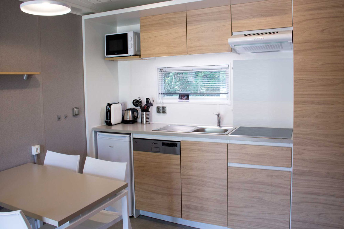 Das Ferienhaus „Kamille“ im Ferienpark Molecaten „Park Hoogduin“ bietet auf 34 qm mit zwei Badezimmern den Komfort eines Hotelzimmers für vier Personen. Das Chalet verfügt über zwei Schlafzimmer, davon ein Schlafzimmer mit Doppelbett und ein Schlafzimmer mit zwei Einzelbetten. Die Küche ist ausgestattet mit 4-Gaskochplatten-Herd, Kombi-Mikrowelle, Kühlschrank mit Tiefkühlfach, Spülmaschine, Nespresso-Kaffeemaschine und Wasserkocher. Das Badezimmer hat eine Dusche und Waschbecken sowie Toilette. Das Auto parkt direkt neben dem Nichtraucher-Ferienhaus; zwei Haustiere sind gegen Gebühr erlaubt.