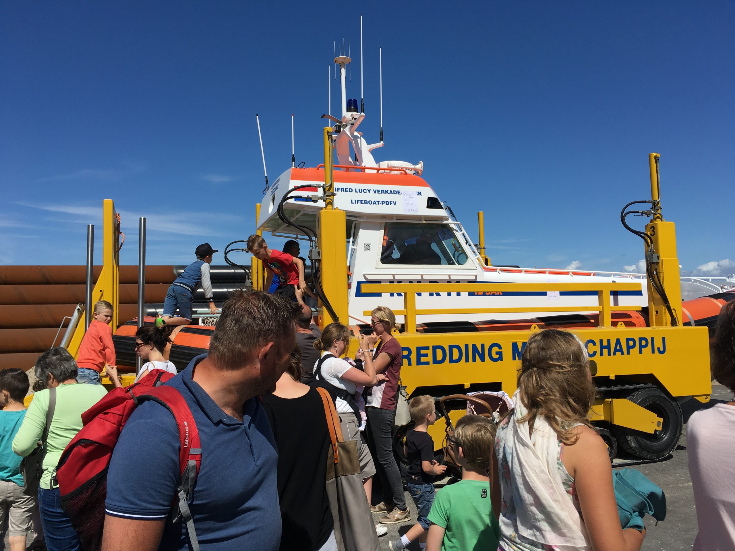 Die KNRM-Rettungsstatiion Cadzand-Bad am Jachthafen öffnete heute abends die Türen des Bootshauses und präsentiert ihr Rettungsboot und ihr technisches Equipment zur Rettung auf See. Die großen und kleinen Besucher können Fragen stellen, einen Blick in das Steuerhaus des wendigen und sturmsicheren Bootes werfen und eventuell einen KNRM-Wimpel, eine Tasse oder eine Broschüre über die KNRM kaufen, da die niederländische Seenotrettungsgesellschaft auf Spenden und Geschenke angewiesen ist.