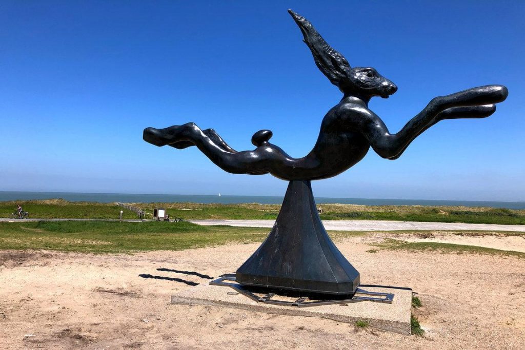 In der Nähe des Naturschutzgebietes „Het Zwin“ am nördlichen Ende der Strandpromenade von Knokke-Heist steht die auffallende Skulptur „Hospitality“, die im Volksmund den Namen ihres Schöpfers trägt: „Flanagan’s Hare“ oder einfach „The Bunny“ aus dem Jahr 1990. Der Grund für die Beliebtheit dieser eigenartigen Skulptur liegt auf der Hand: ein großer Bronzehase, der seit 1997 auf den Dünen springt oder unter dem freiem Himmel fliegt oder schwebt. Die Skulptur symbolisiert Freiheit, Unabhängigkeit und Dynamik und wurde auch schon ausserhalb von Knokke-Heist in New York und Chicago aufgestellt. Der britische Bildhauer Barry Flanagan (1941–2009) ist bekannt für seine dynamischen Tierfiguren, insbesondere fliegende Hasen, die in seinen Werken auf Zeichnungen oder als Skulpturen auftauchen. Die Hasen-Skulpturen sind oft aus Bronze gefertigt und in verschiedenen dynamischen Gesten und Situationen dargestellt, wie beim Springen und Tanzen oder beim Spielen von Musikinstrumenten. Die Skulpturen sind aber nicht nur Darstellungen von Tieren, sondern dienen als Metaphern für menschliche Emotionen und Zustände wie Freude, Überraschung, Sexualität und Neugier.
