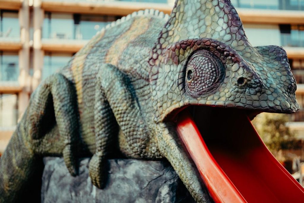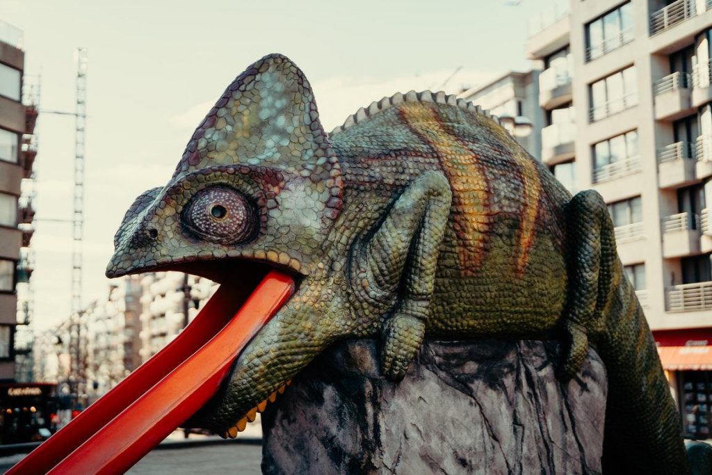 Für die Triennale „Beaufort 21“ realisierte der britische Künstler Jeremy Deller (geb. 1966) am Van Bunnenplein in Knokke-Heist eine monumentale Chamäleon-Skulptur, die zugleich als Rutschbahn fungiert. Dieses Werk verbindet spielerische Interaktion mit kritischer Reflexion und stellt eine bewusste Gegenposition zur traditionellen Monumentkultur dar. Während klassische Denkmäler häufig durch Ernsthaftigkeit geprägt sind, sich auf historische Ereignisse beziehen oder heroische Taten glorifizieren, feiert Deller in seiner Arbeit ein Lebewesen, das meist übersehen wird: das Chamäleon, eines der ältesten Tiere der Erde. Heute ist ihre Existenz zunehmend bedroht – vermutlich infolge des Klimawandels –, auch wenn dieses Thema in Dellers Werk nicht im Vordergrund steht. Stattdessen richtet sich seine Aufmerksamkeit auf die Begegnung von Kunst, Natur und Spiel: Kinder sind eingeladen, die Skulptur zu erkunden und die lange, geschwungene Zunge des Chamäleons als Rutsche zu nutzen. Mit dieser interaktiven Installation im Zentrum von Knokke-Heist hinterfragt Deller die gängige Vorstellung, Kunst im öffentlichen Raum müsse primär repräsentativ oder gedenkend sein. Er verwandelt das Denkmal in einen Ort des Staunens, der Freude und des Nachdenkens über die Beziehung zwischen Mensch und Natur. „Chamäleons haben etwas Magisches an sich“, erklärt Deller. „Sie können Dinge tun, von denen wir nur träumen können, und sie gehören zu den schönsten Lebewesen unseres Planeten. Wir sollten ihnen Ehre erweisen.“