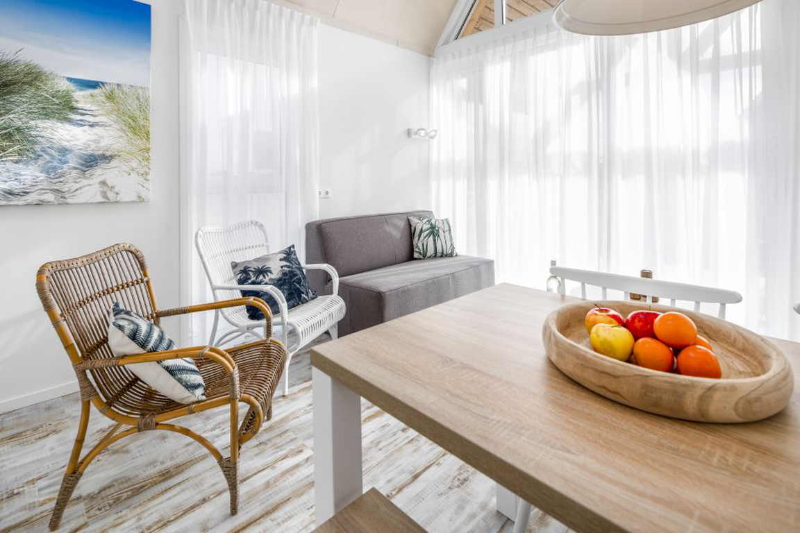 Die als erstes errichteten 40 „Beach Lodges“ im „Beach Resort Nieuwvliet-Bad“ bieten ab 246,- € pro Kurzwoche maritimen Wohnkomfort auf 37 Quadratmetern für bis zu vier Personen. Die auf 222 Quadratmetern Grundstücksfläche freistehenden Holzhäuser haben zwei Ebenen mit einem Schlafzimmer und Badezimmer im Erdgeschoss und einem Schlafzimmer im Obergeschoss. Das Wohnzimmer mit Fußbodenheizung, Smart-TV-Gerät und großer Fensterfront geht über in eine überdachte Außenterrasse mit Lounge-Set, die aufgrund ihrer Südausrichtung von mittags bis abends Sonne hat.