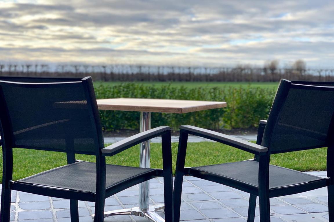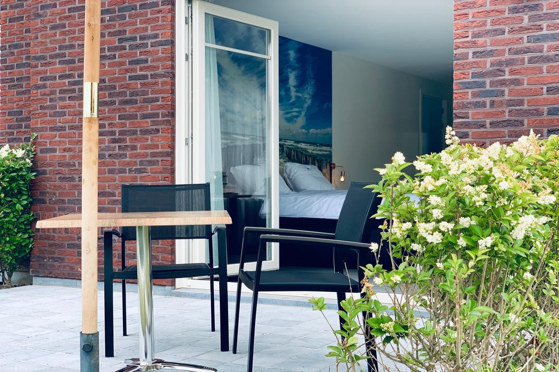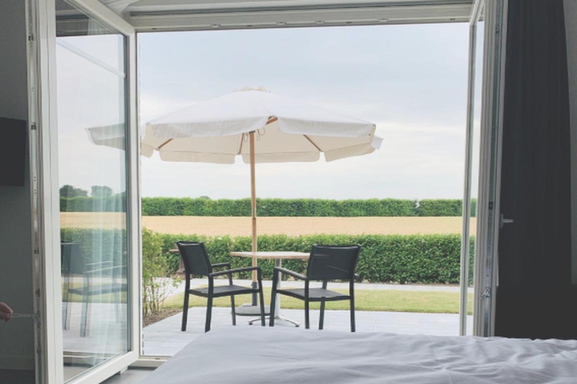 Von der mit Tisch und Stühlen möblierten Terrasse jedes Zimmers des „Groede B&B“ genießen Gäste den freien Blick auf die Felder und Weiden rund um das authentische Künstlerdorf Groede. Jeden Morgen servieren die Inhaber des „Grode B&B“ Annelies und Silvan auf den Zimmern oder bei gutem Wetter auf der Terrasse ein umfangreiches kontinentales oder À-la-carte-Frühstück mit regionalen Produkten.