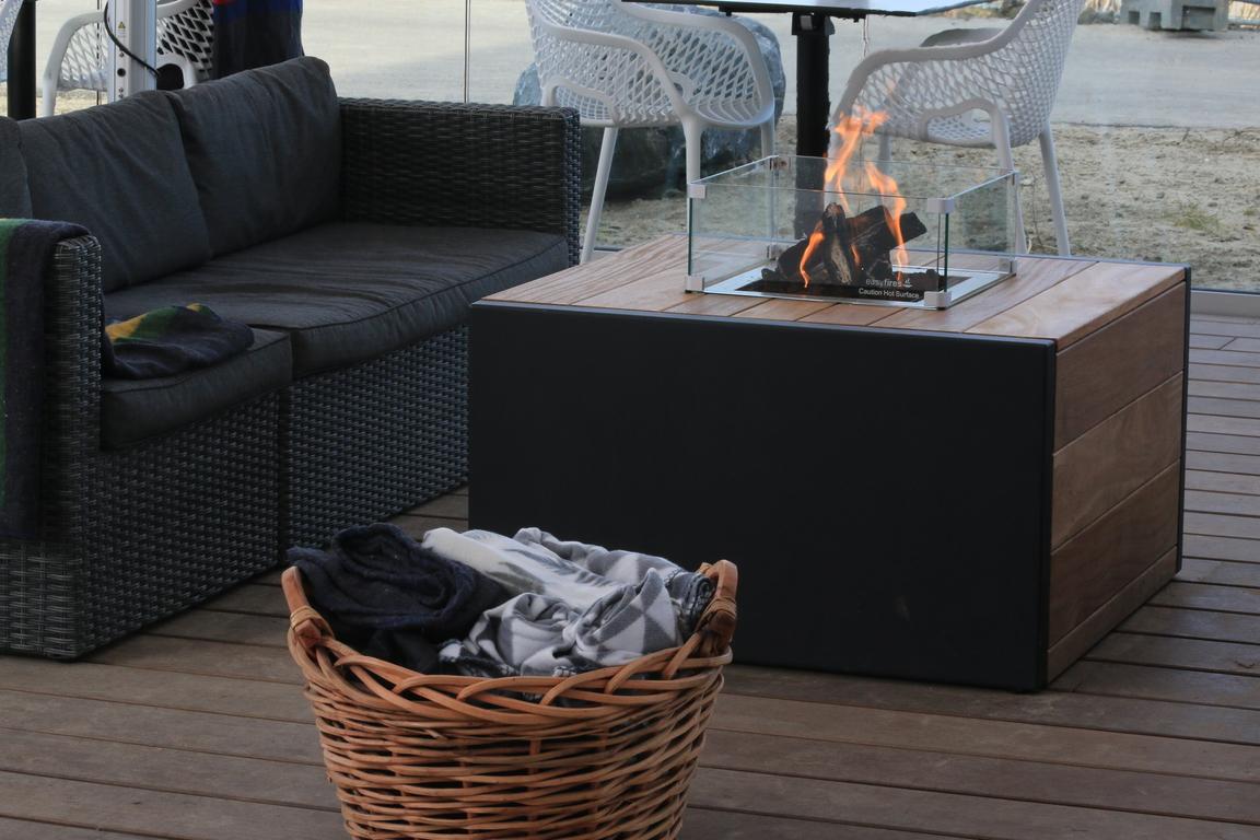 Die Top-Lage mit „Water-Front-View“ bietet bei Sonne wie Sturm einen geschützten Panorama-Blick über den Strand auf Höhe des Strandpavillons „Caricole“ und die Nordsee am nordöstlichen Dünenboulevards Cadzand-Bads. Und diesen Blick genießen Gäste aus dem Gastraum mit 40 Plätzen und der davor gelagerten Terrasse mit Windschutzscheiben und Tischfeuer ebenso stilvoll wie gemütlich. Das Restaurant mit Bar und dahinterliegender offener Küche bietet modern schwarz-weißes Innendekor mit großen Schwarz-Weiß-Porträts und Rautenmuster, die Esstisch sind im Vintage-Stil aus dunklem Holz mit Eisenumfassung.
