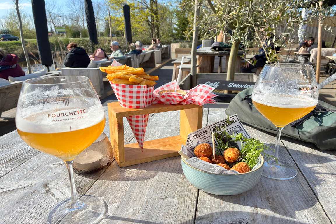 Im Self-Service gibt es bei „La Terrasse 364“ eine umfangreiche Getränkeauswahl aus Bieren, Weinen, Cocktails, Softdrinks und natürlich Kaffees und Tees. So klein, wie das Restaurantgebäude ist, können hungrige Gäste dennoch aus einer recht umfangreichen Speisekarte aus kleinen, aber auch größeren Gerichten auswählen. Das Angebot startet mit Pommes Frites und Kroketten geht über Croque Monsieur und Spaghetti bis Vol au Vent („Königinpastete mit Geflügel“). Bei unserem Besuch schmeckte uns besonders der frisch und selbst gemachten Apero-Mix aus sechs „Bolletjes“ in dreierlei Geschmacksrichtungen (15 Euro) mit einem perfekt gezapften „Fourchette„-Bier.