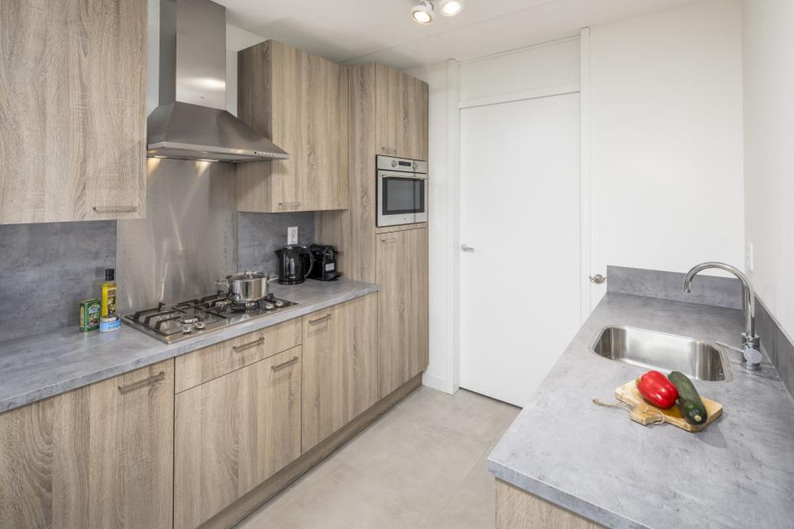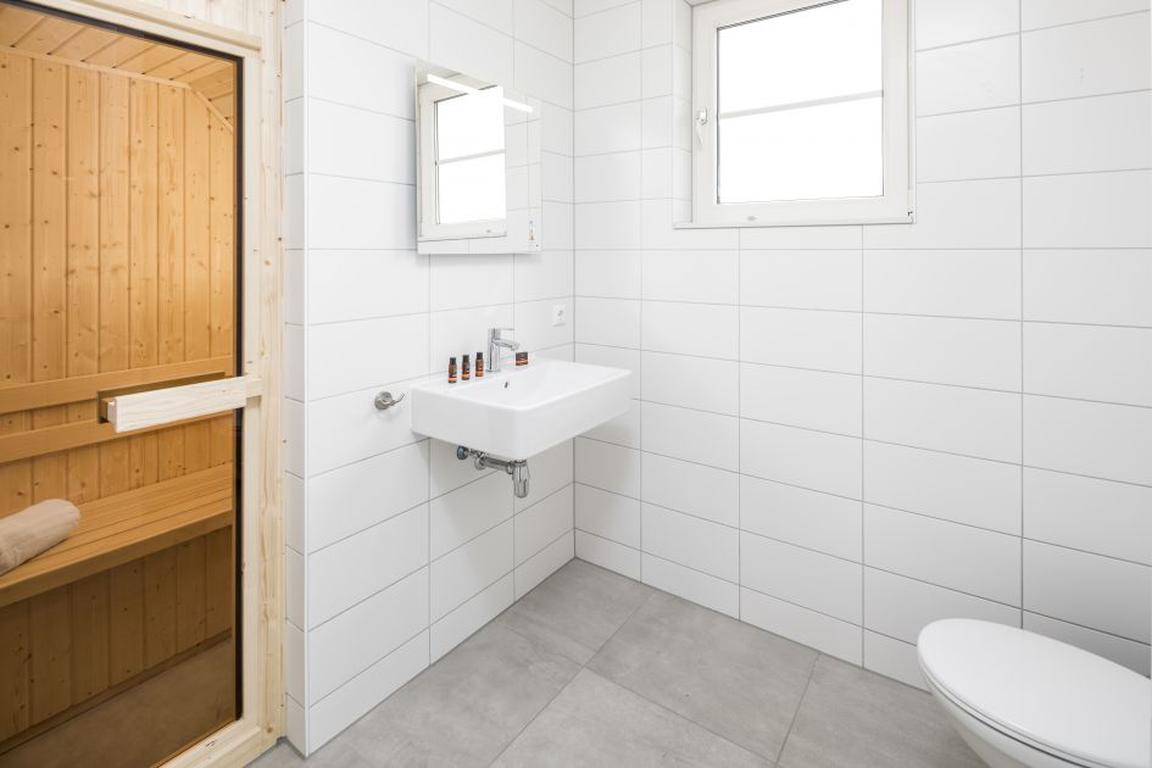 Die offene Küche ist modern und praktisch eingerichtet mit vierflammigen Gasherd, Dunstabzugshaube, Wasserkocher, Nespressomaschine, Kühlschrank mit Gefrierfach, eingebauter Kombi-Mikrowelle und Geschirrspüler. Sie grenzt an das hochwertig möblierte Wohnzimmer an, das einen gemütlichen Sitzbereich mit einem Sofa, zwei Sesseln und einem Couchtisch sowie einem Esstisch mit Sitzmöglichkeiten für vier Personen bietet. Waschmaschine und Trockner sind in den Villen des Typs V4 Luxe ebenso vorhanden wie ein Abstellraum für zwei Fahrräder.