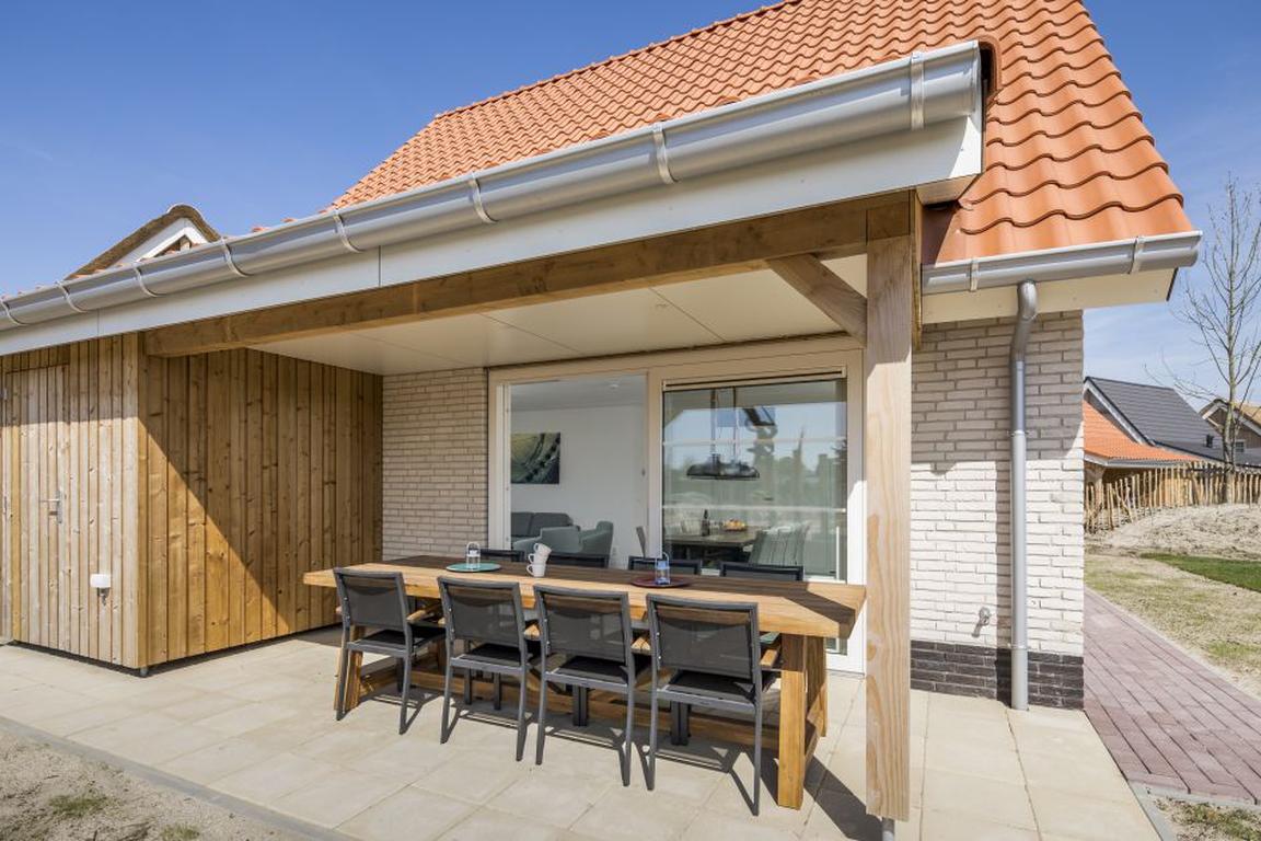 Das Wohnzimmer bietet mit Schiebetüren bequemen Zugang zur Terrasse und zum Garten, die Teilüberdachung, die Gartenmöbel für 8 Personen und der Sonnenschirm sorgen für komfortable und entspannte Nutzung des Aussenbereiches. Einige der insgesamt elf V84A Luxe-Ferienhäuser, die vorrangig am südlichen Rand des „Beach Resort Nieuwvliet-Bad“ liegen, haben zusätzlich eine „Rain Shower“-Dusche, Terrassenheizer und Lounge-Möbel. Je nach Villen-Typ sind Haustiere wie Hunde oder Katzen willkommen oder sind die Gärten eingezäunt. Zu den Villen des Typs V8A Luxe gehören zwei Stellplätze für PKWs; WiFi/WLAN ist gratis.
