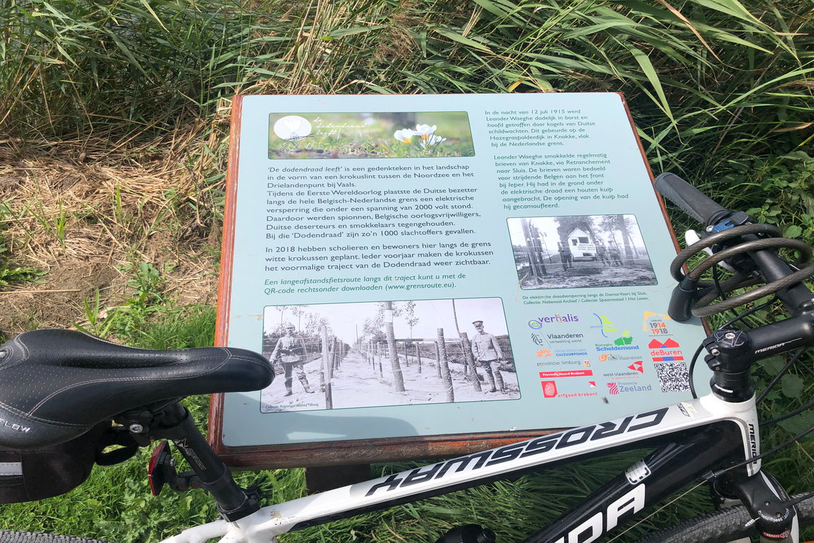 Bei Retranchement in der landeinwärtigen Biegung des „Uitwateringkaanal“ erinnert ein kleines Feld aus weißen Krokussen jedes Frühjahr an ein trauriges Kapitel der deutsch-belgisch-niederländischen Geschichte und der Grenze zwischen Belgien und der Niederlande: Den „Doodendraad“. Der „Totenzaun“ war ein 300 Kilometer langer Hochspannungszaun in Belgien, der sich während des Ersten Weltkrieges zwischen 1915 und 1918 an der Grenze zwischen Belgien und der Niederlande vom damaligen Vierländereck bei Neutral-Moresnet bis zur Nordseeküste zwischen Knokke-Heist und Cadzand-Bad erstreckte. Errichtet wurde der „Doodendraad“ als „Grenzhochspannungshindernis“, so die offizielle deutsche Bezeichnung, vom deutschen Generalgouvernement Belgien, um die offene Grenze Belgiens zu den Niederlanden für kriegsfreiwillige Belgier, deutsche Deserteure, Schmuggler und Spione zu sperren.