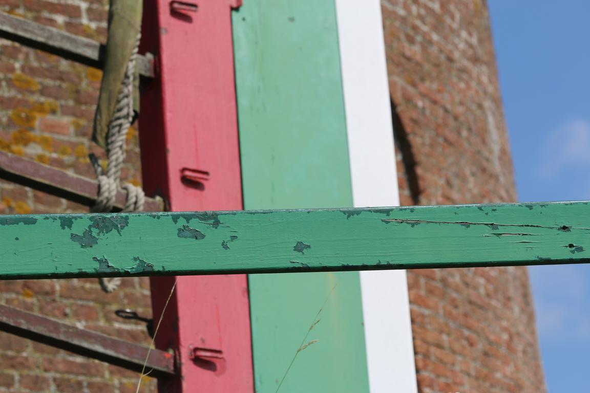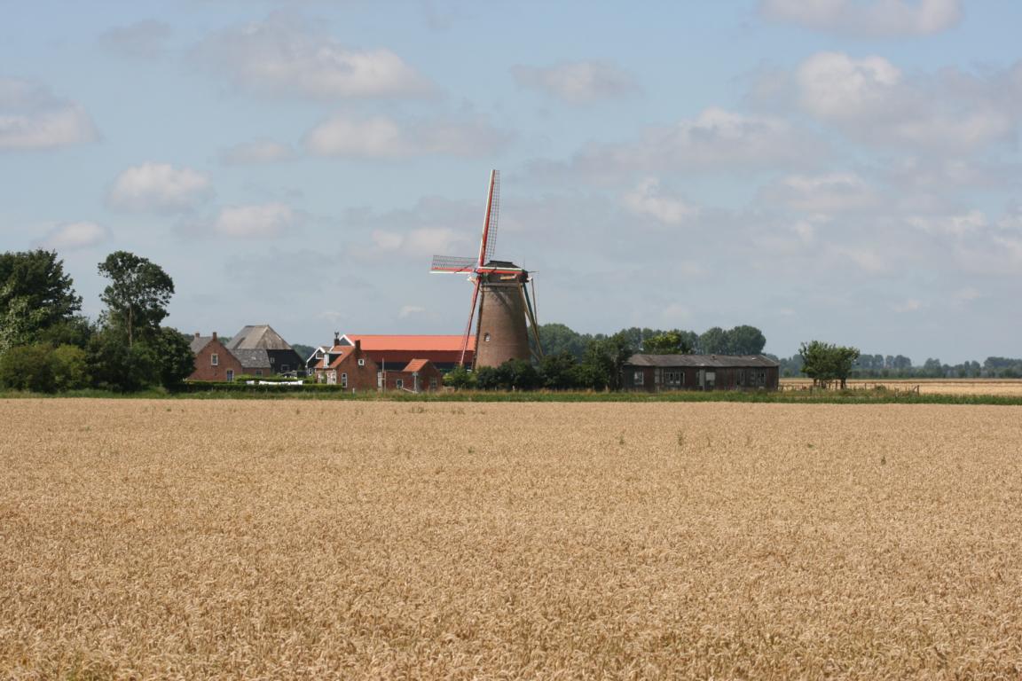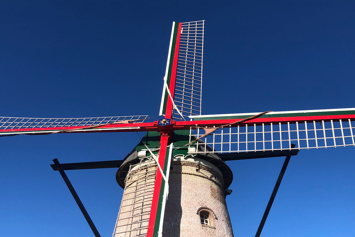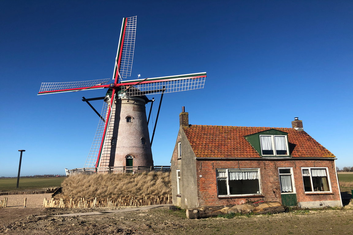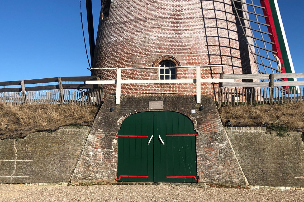 Malerischer kann wohl kaum eine Windmühle wie die von Zuidzande liegen: Im Hinterland von Cadzand-Bad, mitten in den Poldern, am westlichen Rande des Dorfes am Sluissedijk. 1874 wurde die namenlose Mühle erbaut, 1981/1982 restauriert, seit 1999 ist sie nicht mehr im Betrieb. Die Getreidemühle ist im Besitz der Stiftung ‚Behoud Zuidzandse Molen‘ (Stiftung zur Erhaltung der Zuidzande-Mühle) erworben, die auch einen großen Zuschuss von der Provinz Zeeland für die Restaurierung erhalten hat. Das Mauerwerk wurde 2020 mit ausgetauschten und neu verfugten 7.000 Steinen repariert, ein neuer „Steert“ (Schwanz) und ein neuer Giebel werden angebracht, und die Kappenkonstruktion und der Antrieb werden repariert. Nun steht die Mühle quasi wie neu da. Neben der beeindruckenden Mühle ist noch das alte Haus des Müllers platziert, ansonsten steht die Mühle auf ihrem Sockel frei im Feld und kann mit ihrer Spannweite von 24,20 Metern den Wind über den Feldern von Zuidzande frei empfangen.
